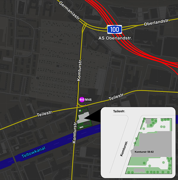 Verkehrsgünstig und citynah im Bezirk Tempelhof. 7,5 km sind es bis zum Potsdamer Platz – d.h. (ohne Stau) 14 Minuten Autofahrt. Stadtautobahn: 1 Minute von der A 100, Ausfahrt Oberlandstraße