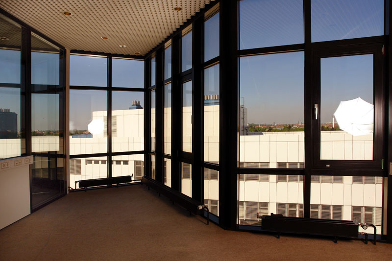 Die Luxusetage: Die 5. Etage ist die ehemalige Vorstandsetage mit Blick über die Stadt, besonders der alte Flughafen Tempelhof ist gut zu sehen. Büros sind teilweise holzvertäfelt und verfügen über eigene Waschgelegenheiten in den Einbauschränken. Besprechungsräume in der Mitte des Flures aus Glaselementen, natürliches Licht fällt aus Oberlichtern. Es gibt im 5. OG einen eigenen Konferenzraum.
